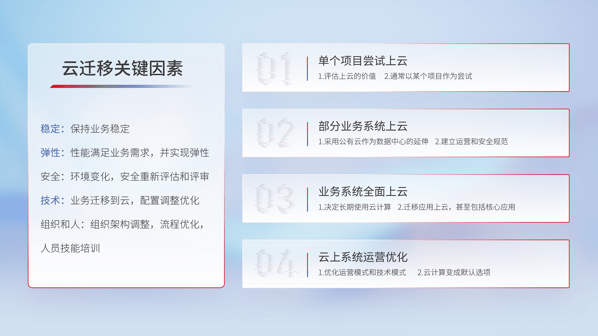 结合实际业务,,,从规划设计、、云平台选型、、、云原生改造、、数据迁移、、、、集成交付,,迁移全过程为客户识别最佳上云路径,,,,做好风险识别管理,,,,设计网络架构、、、、身份权限、、安全审计合规、、、、操作审计、、日志审计、、、监控告警策略、、、、多站点容灾设计等,,,,对云上基础设施进行整体规划,,提升IT治理水平,,,以满足弹性、、高可用、、高性能的需求。。。。